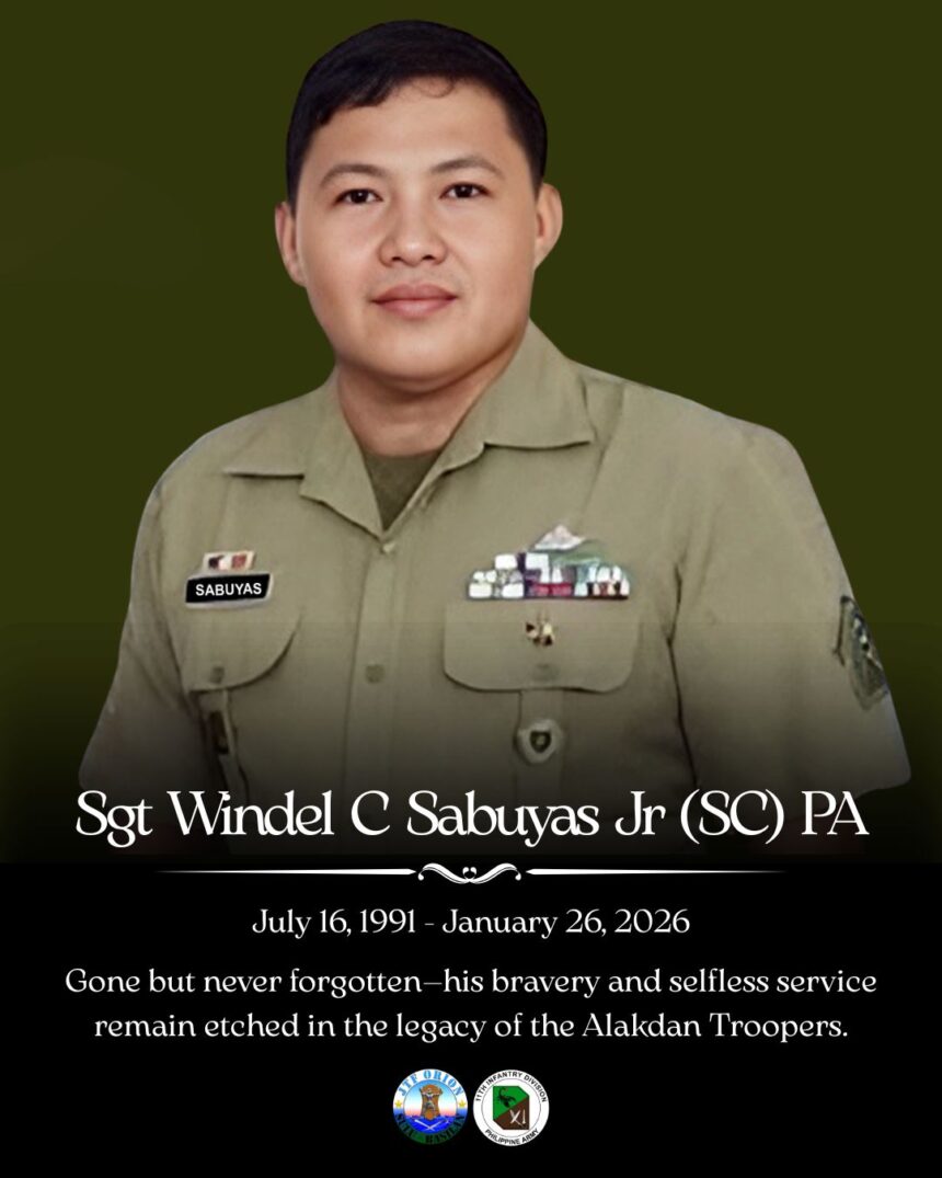 ZAMBOANGA CITY – A soldier’s final act of courage has become his lasting legacy. Staff Sgt. Windel Sabuyas, who gave his life while helping passengers during the sinking of the MV Trisha Kerstin 3 in Basilan, was posthumously awarded the Bronze Cross Medal and accorded full military honors. The medal was presented to his widow, Jenelyn Sabuyas, in recognition of…
