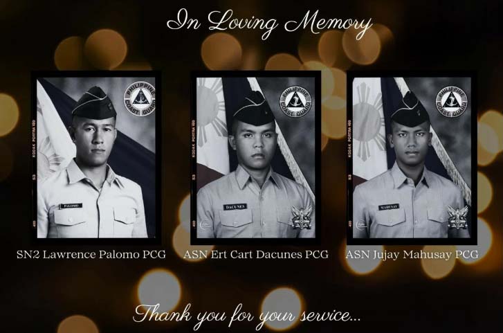 PCG Commandant Adm. Ronnie Gil Gavan identified the fallen coastguardians as Seaman Second Class Lawrence Palomo, assigned at the Maritime Safety Services; and Apprentice Seamen (ASN) Jujay Mahusay and Ert Cart Dacunes, from the PCG Training Center-Masbate.