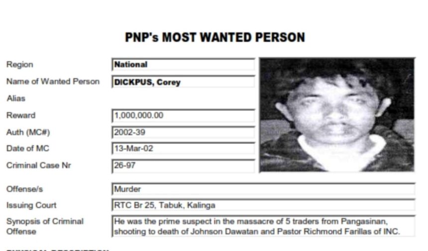 The suspect, identified as Corey Dickpus, 64, was a former barangay captain and vice mayor of Lubuagan. He had long been listed as a national most wanted person by the Department of the Interior and Local Government (DILG), with a ₱1 million bounty for his capture.