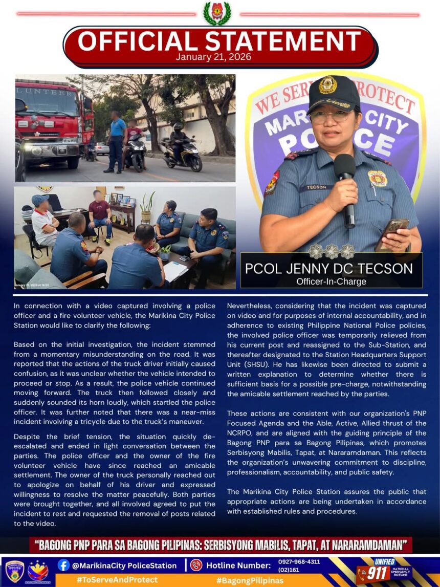 The Marikina City Police Station announced on Friday, January 23, that a police officer caught in a viral video blocking a volunteer fire truck has been temporarily relieved from his post.