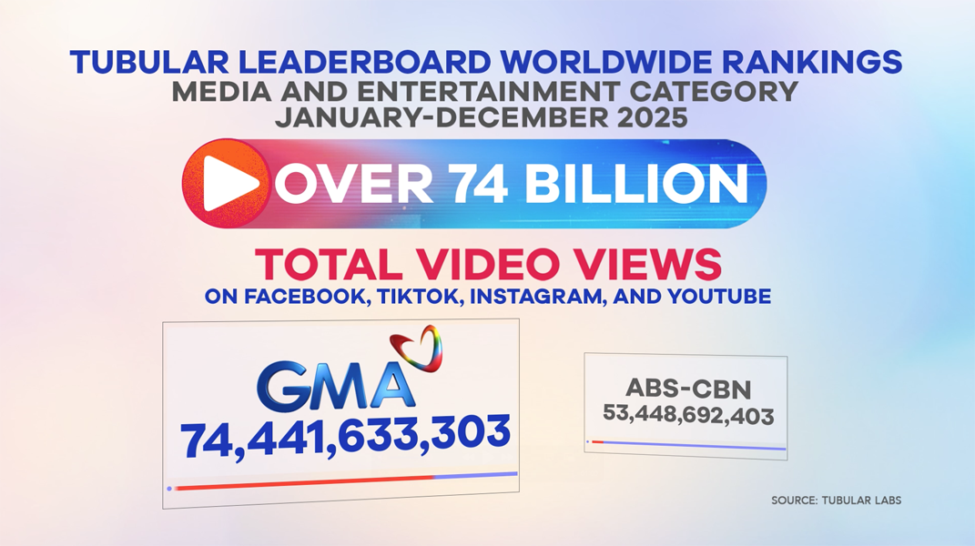 As of December 31, 2025, official GMA Network creator properties generated more than 74.4 billion video views—35.1 billion on Facebook, 26.3 billion on TikTok, 10.4 billion on YouTube, and 2.6 billion on Instagram.