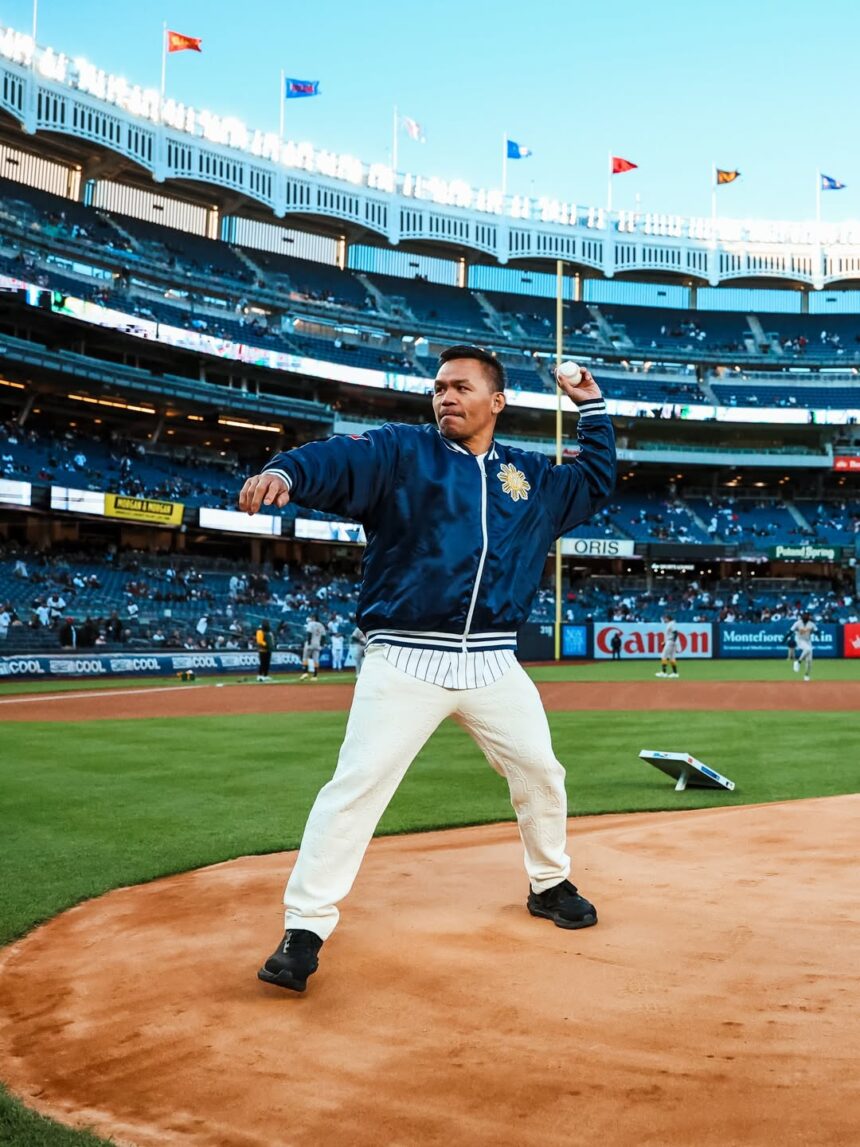 From the boxing ring to the baseball diamond field, the 47-year-old Pacquiao looked at ease – he played the sport during his elementary days – throwing the ball to New York Yankee catcher JC Escarra that had the crowd roaring in approval at the Yankee Stadium that saw the host prevailing, 5-3.