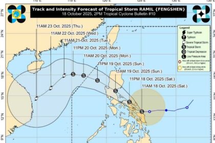 Tropical Storm Ramil (international name: Fengshen) slightly weakened Saturday afternoon, Oct. 18,…